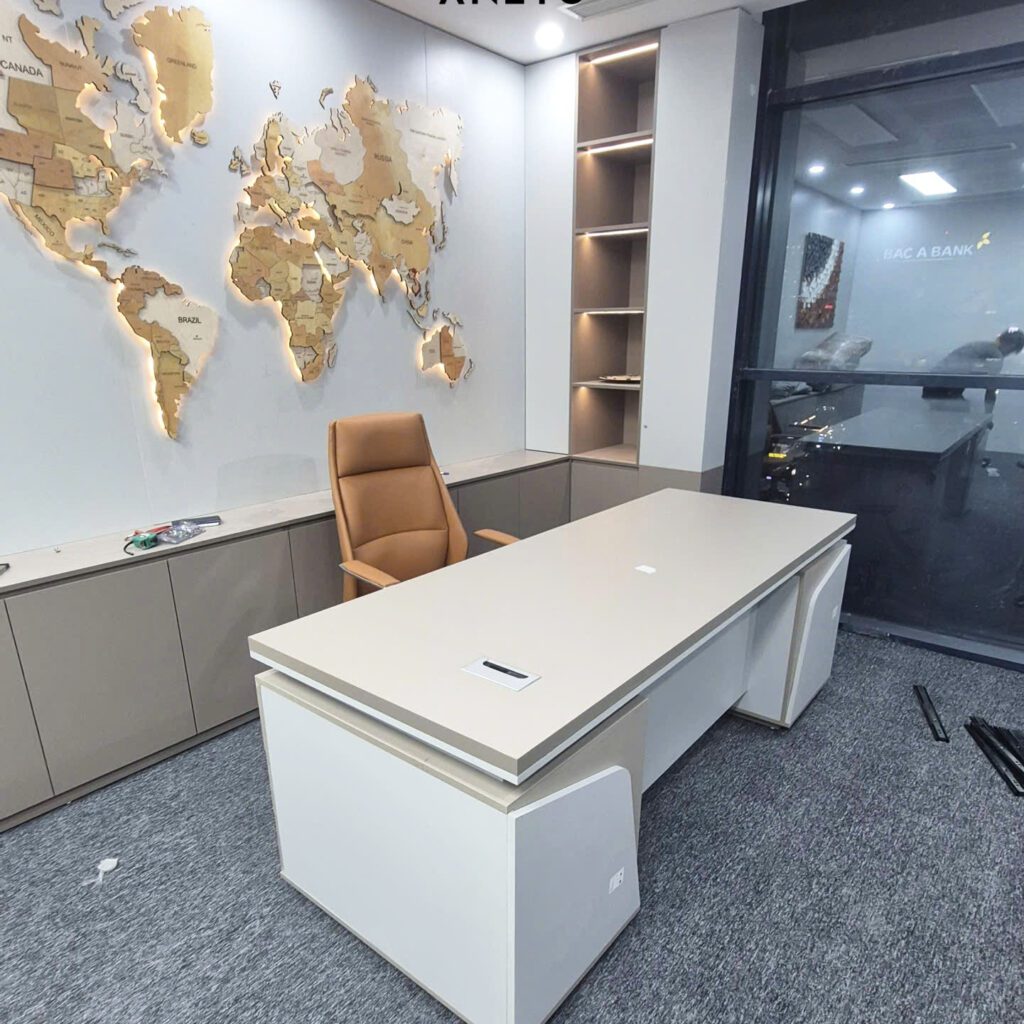 Điểm nhấn nghệ thuật đặc biệt của dự án là bản đồ thế giới 3D bằng gỗ khắc CNC gắn tường, tích hợp hệ thống đèn LED hắt sáng phía sau. Chi tiết này không chỉ đóng vai trò trang trí mà còn mang ý nghĩa biểu tượng sâu sắc, thể hiện tầm nhìn toàn cầu và khát vọng vươn xa của doanh nghiệp. Hiệu ứng ánh sáng vàng dịu nhẹ tạo chiều sâu cho mảng tường, giúp không gian trở nên ấm áp và sang trọng hơn, đồng thời tăng giá trị thẩm mỹ tổng thể. Đây là yếu tố góp phần tạo nên bản sắc riêng cho phòng lãnh đạo, khiến không gian không còn đơn thuần là nơi làm việc mà trở thành nơi thể hiện tư duy và chiến lược phát triển.