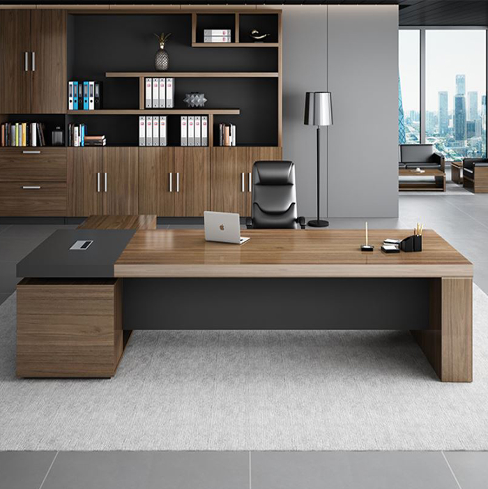 * Vật liệu cao cấp: Bàn giám đốc được chế tác từ gỗ công nghiệp MFC nhập khẩu phủ melamine, đảm bảo độ bền và thẩm mỹ vượt trội.
